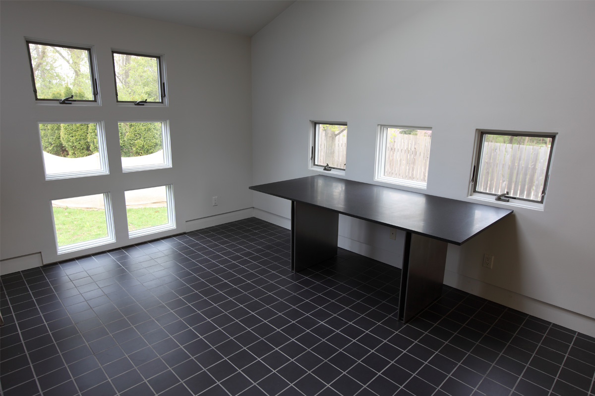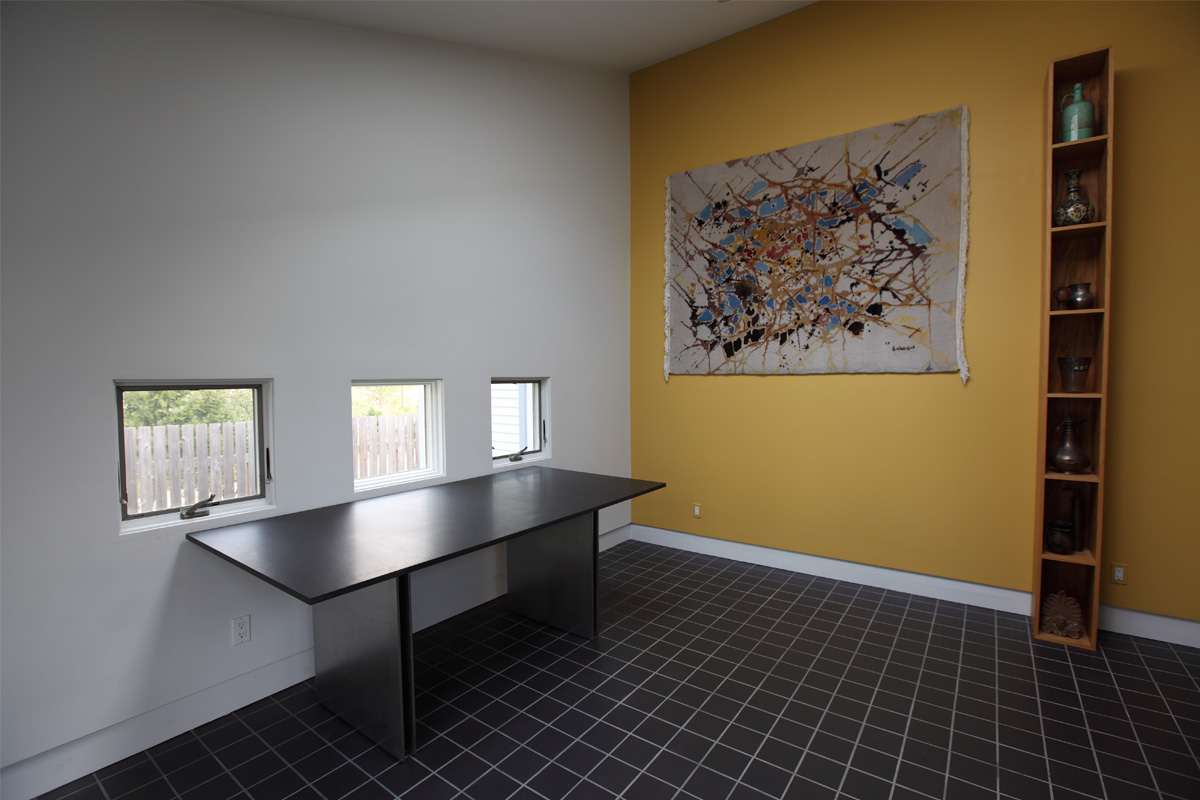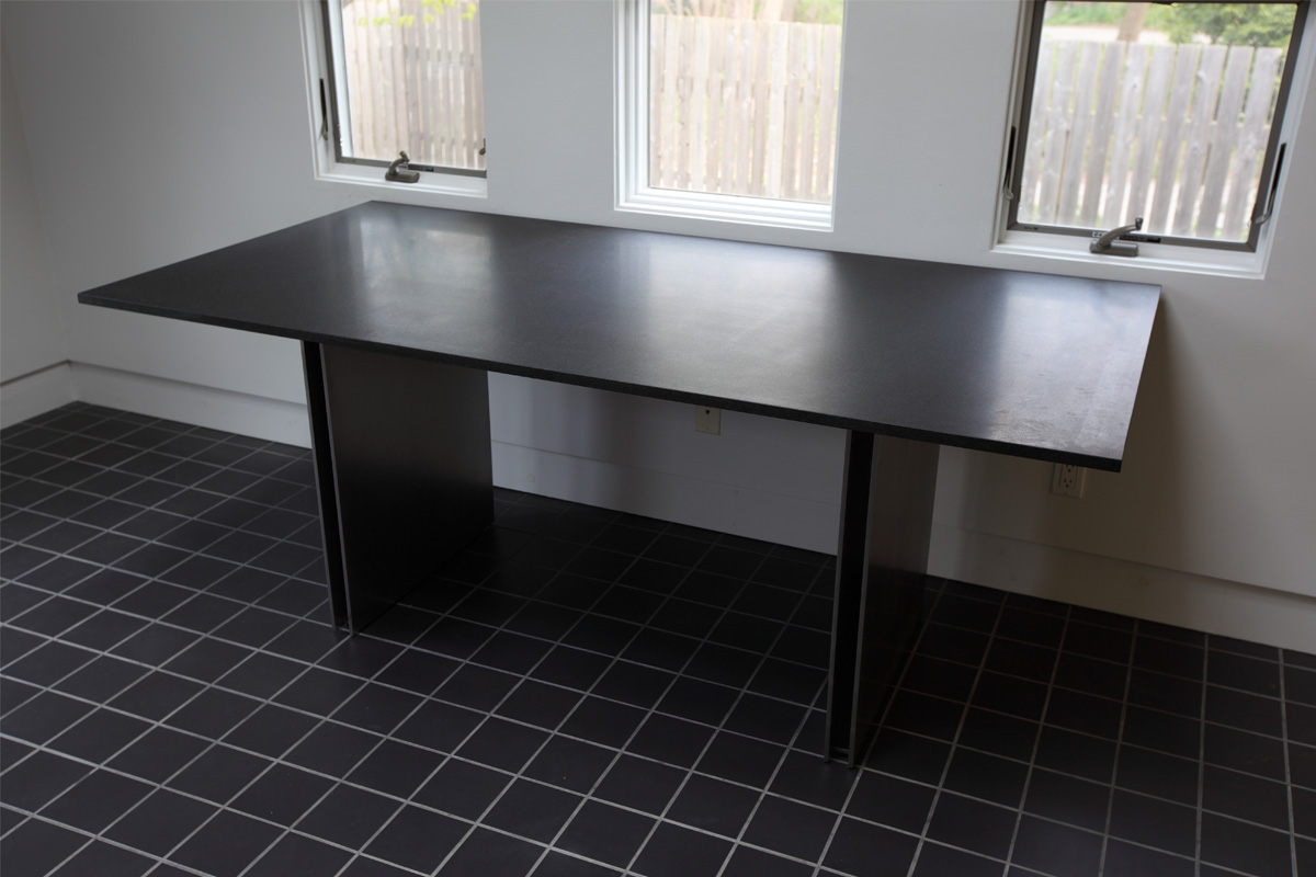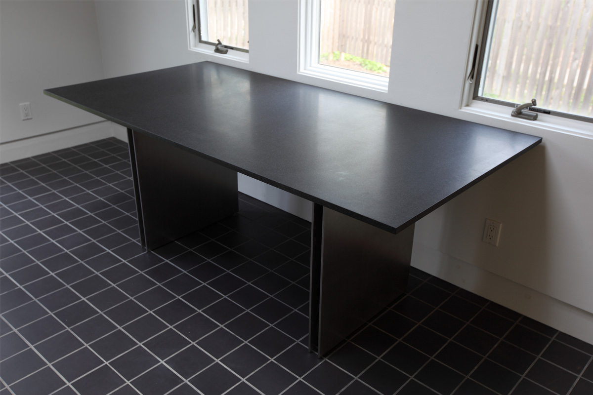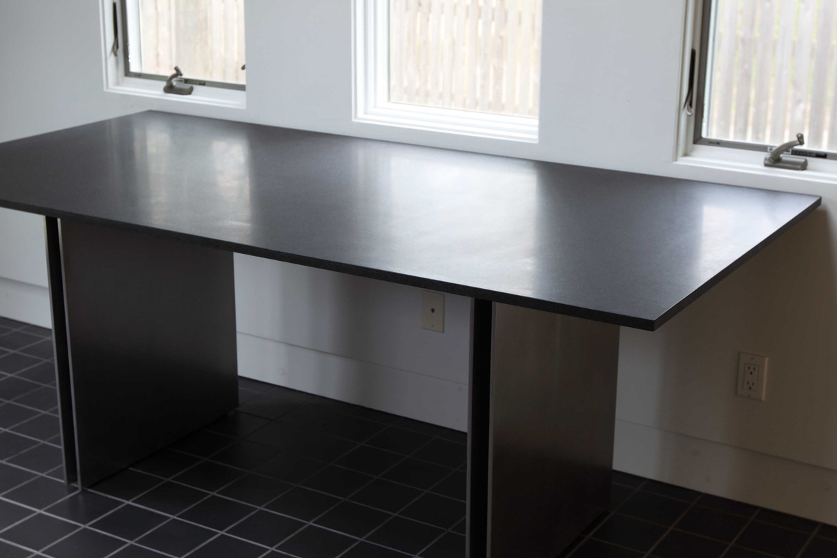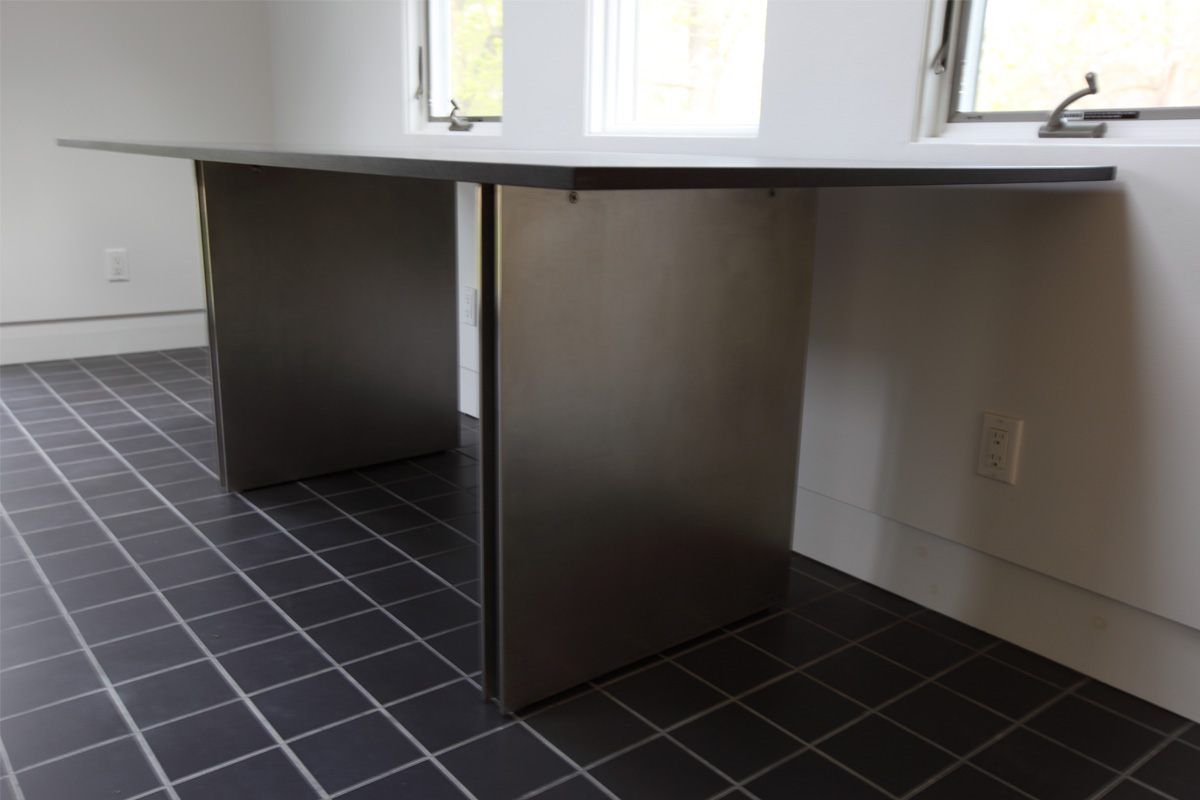 Ann Arbor, MIStainless steel vertical 3/8” plate legs with a linear brush finish. Black Absolute granite top blind fastened to leg sets. Tags: ArchitecturalStainless SteelGraniteAnn ArborMichigan