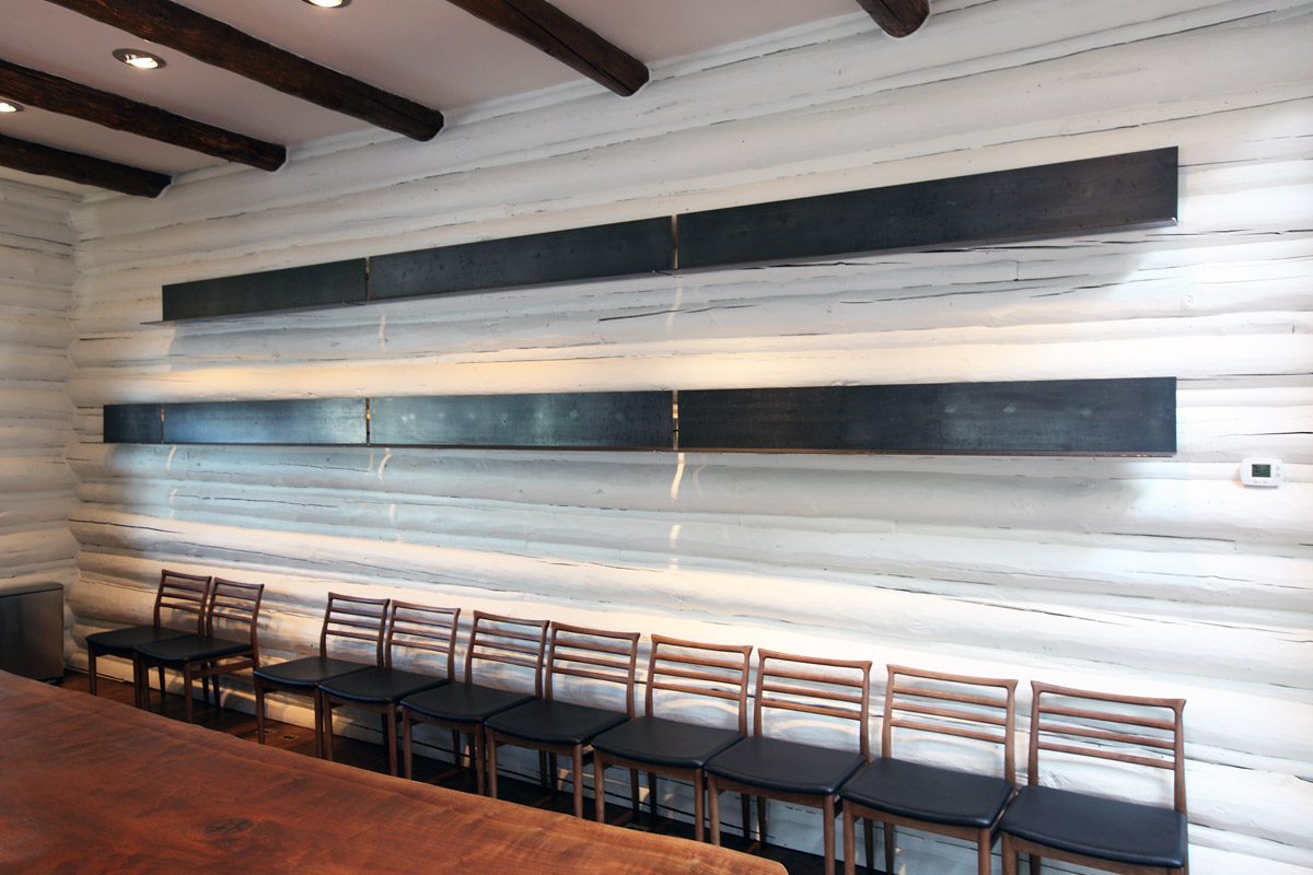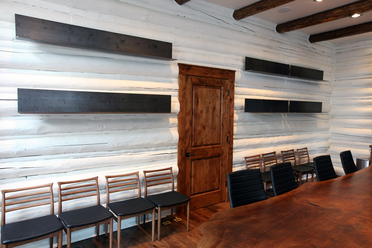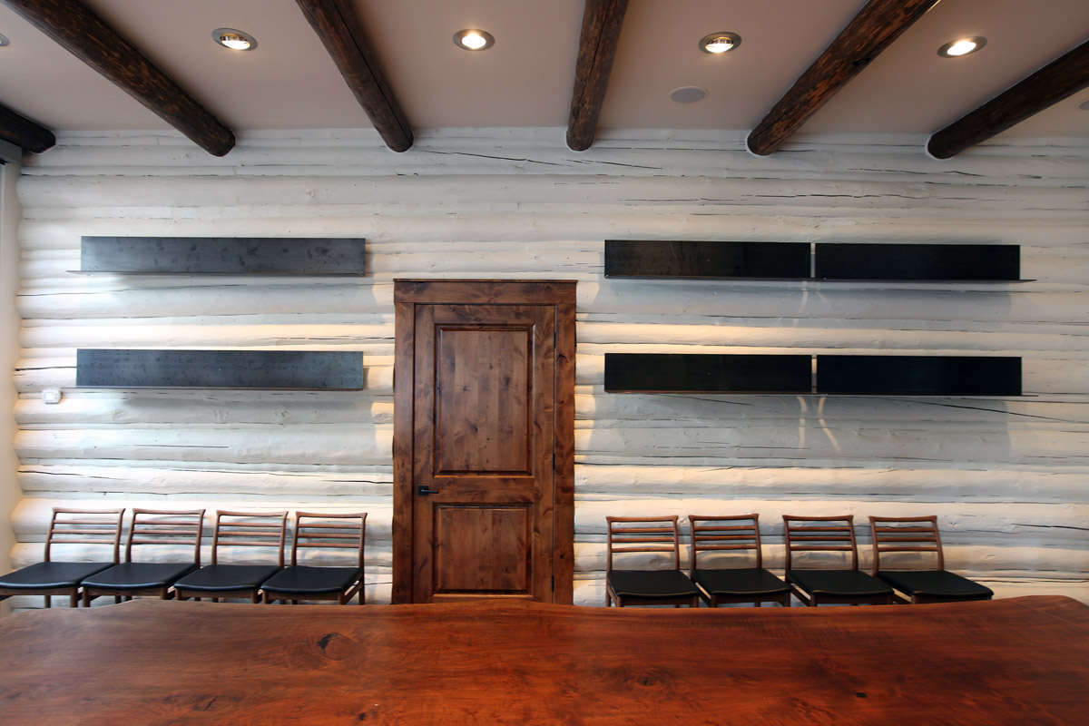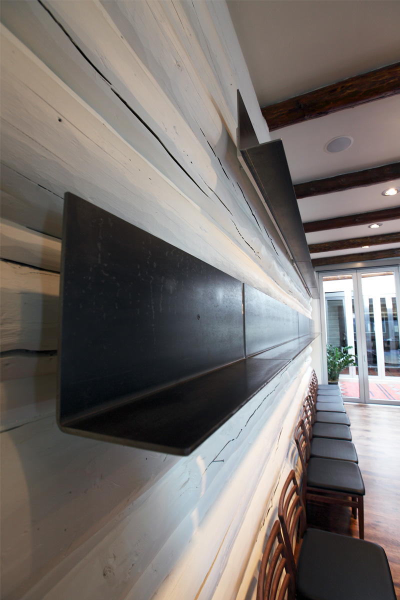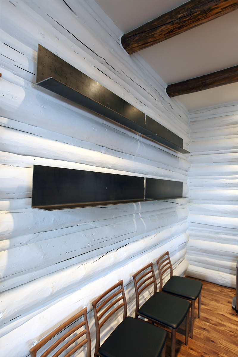 Jackson, WY¼” plate shelving with radius exposed edge and a mill finish with triple wax topcoat. Mounting system developed to straight mount floating shelves on a turn of the century log wall. Tags: ArchitecturalWaxMill FinishShelvesJacksonWyoming