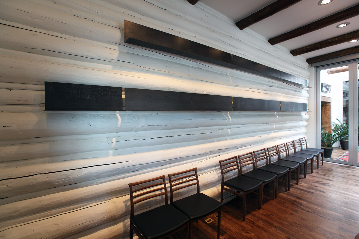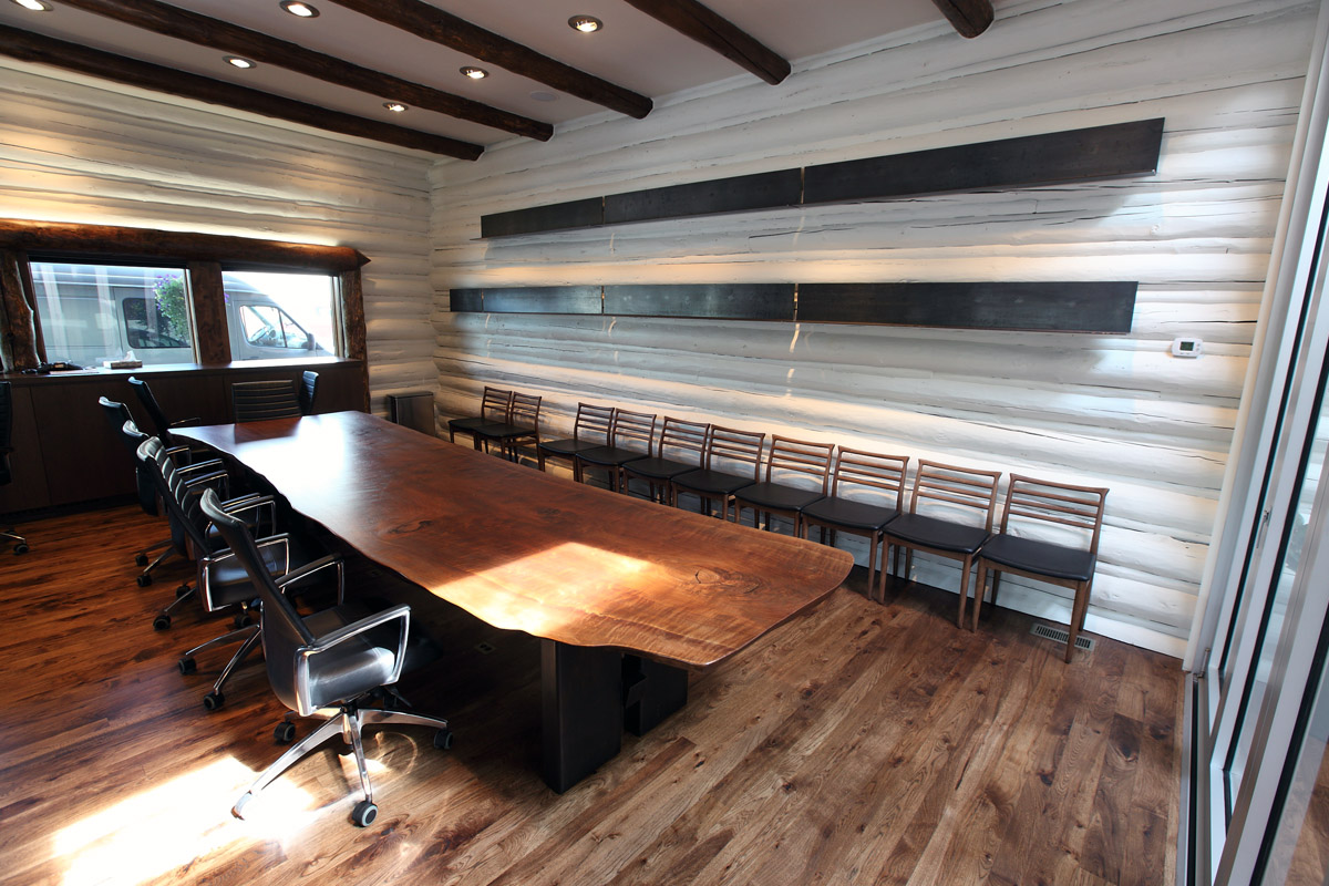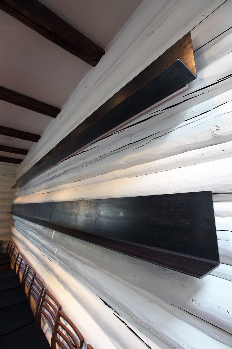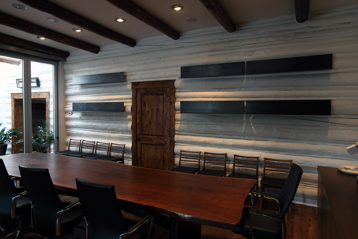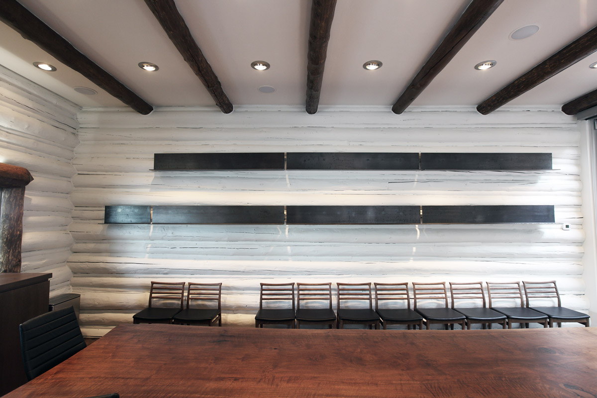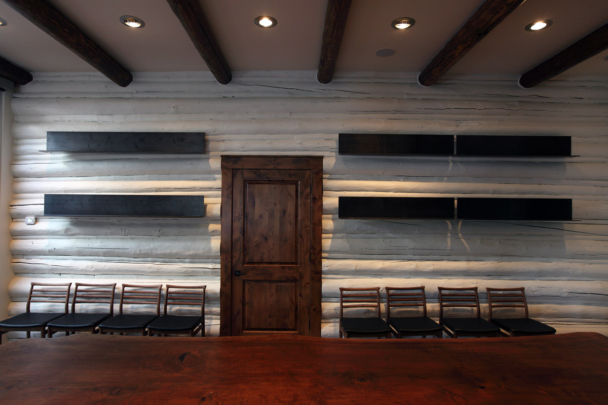 Jackson, WY¼” plate shelving with radius exposed edge and a mill finish with triple wax topcoat. Mounting system developed to straight mount floating shelves on a turn of the century log wall. Tags: ArchitecturalWaxMill FinishShelvesJacksonWyoming