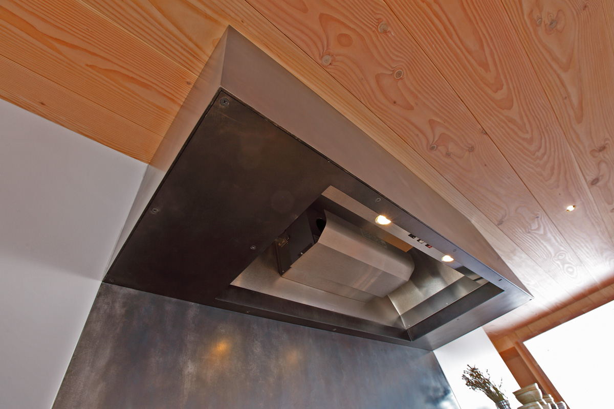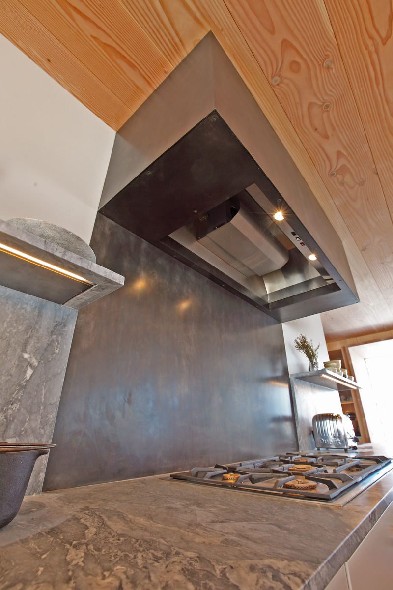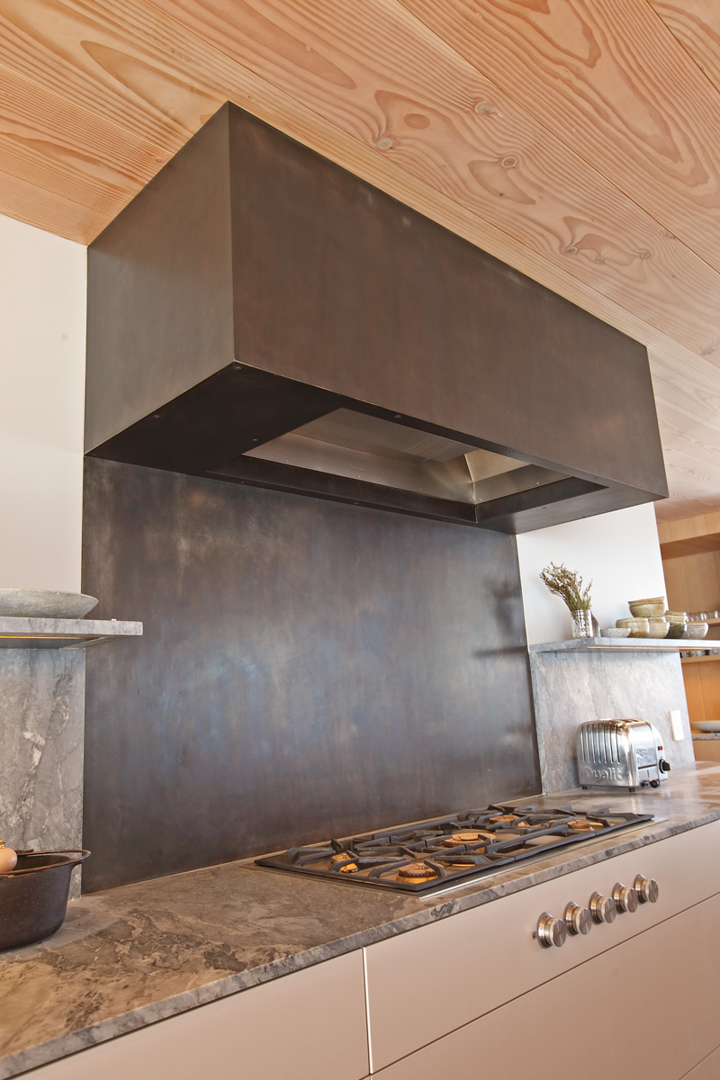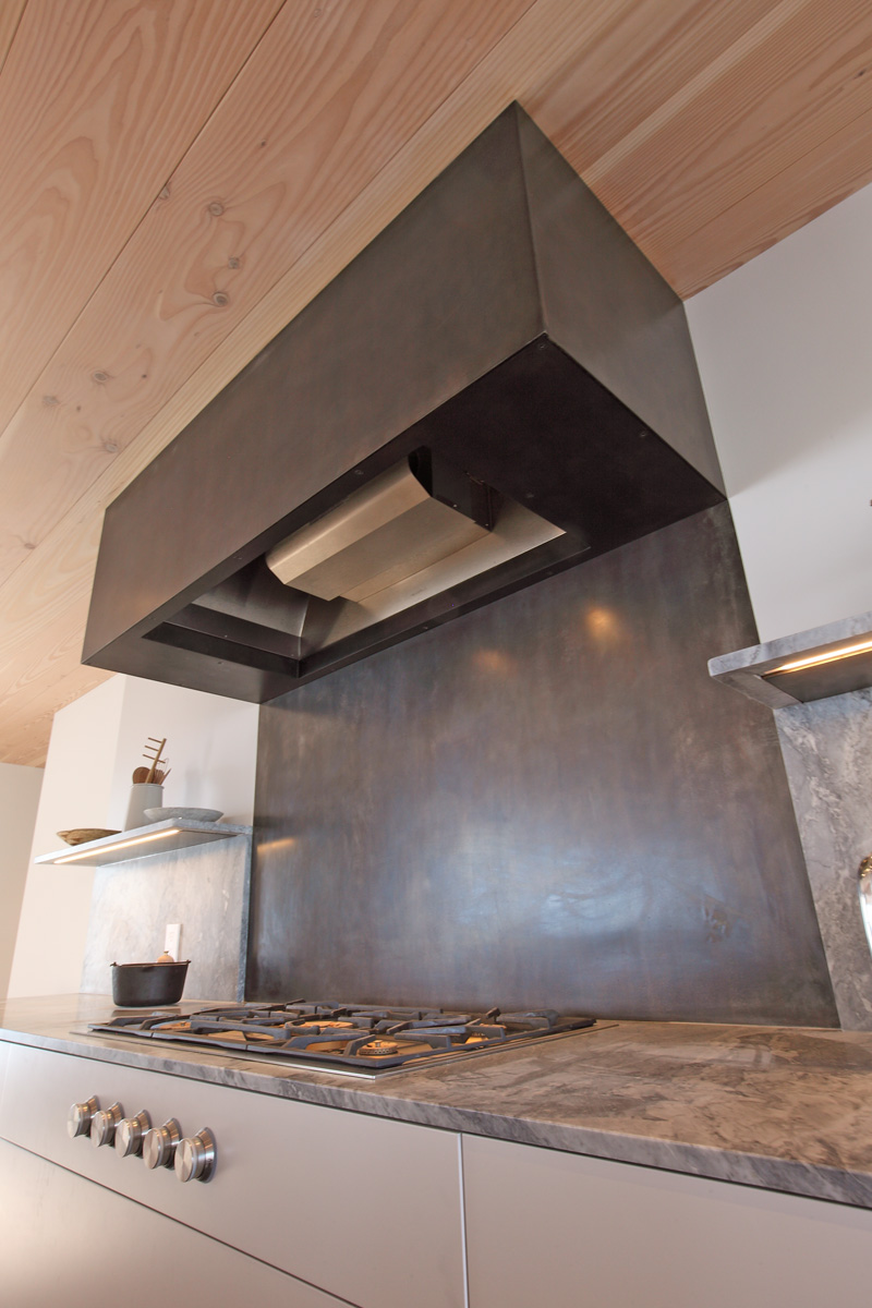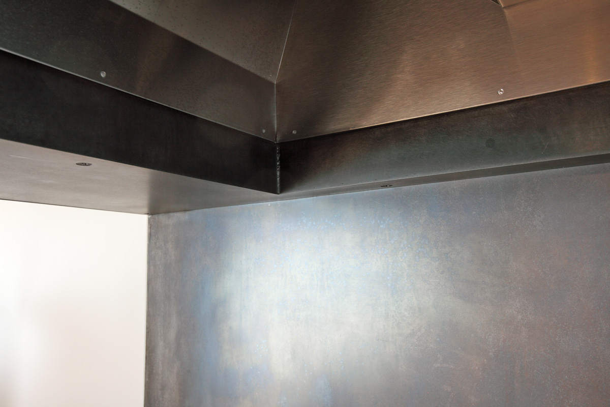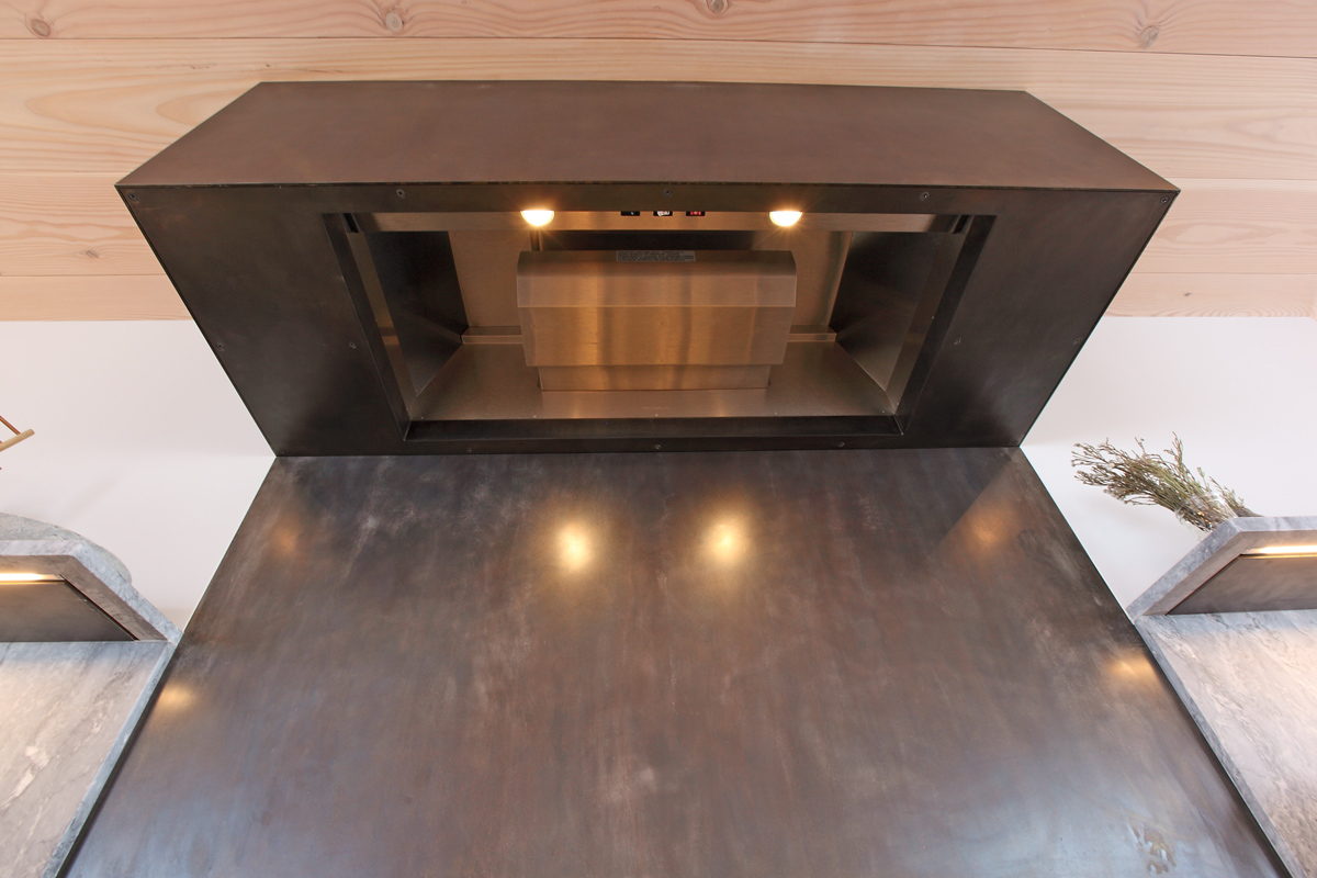 Jackson Hole, WYModernist vent hood surround to be used with Vent-a-Hood factory insert, countersunk fasteners, crisp joinery, and a gun bluing patina provide an aged feel with a modern aesthetic. Tags: Architecturalvent hoodmodernJackson HoleWyoming