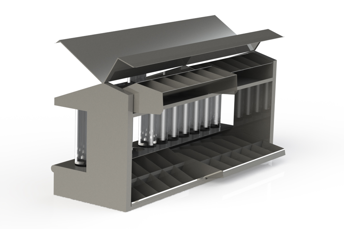 Ann Arbor, MIBrushed stainless steel construction with removable upper and lower dispensing trays. Coffee varieties are viewable thru tempered glass cylinders; a fully cleanable and food safe dispenser for your favorite local café. Tags: Research & DesignCADAnn ArborMichigan