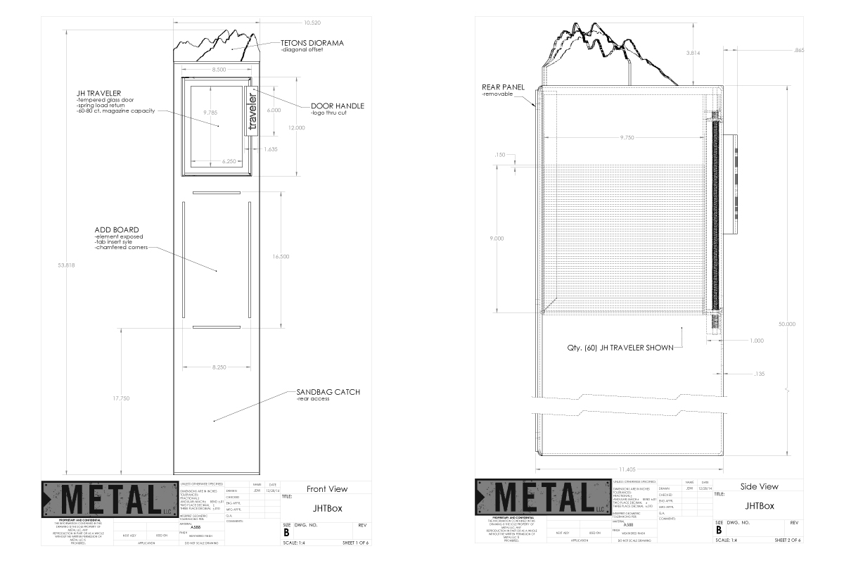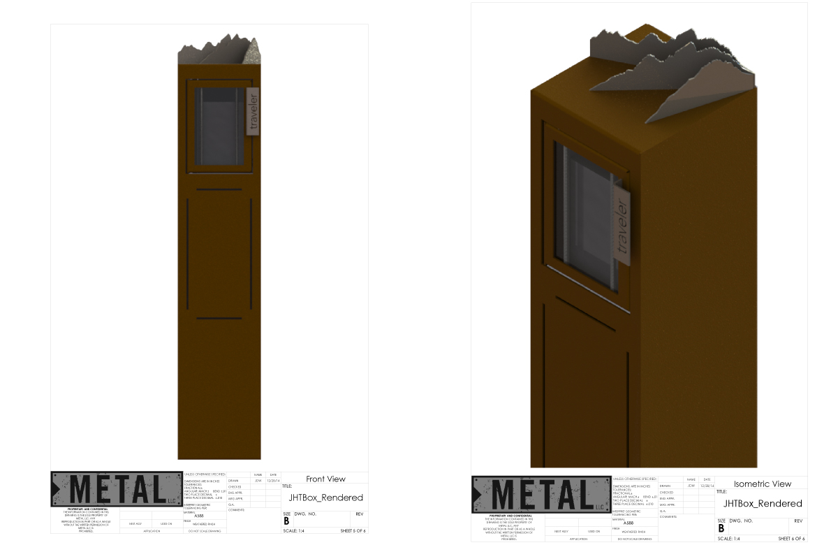10G Corten sheet formed periodical box for use in distributing the Jackson Hole Traveler in public hotspots of downtown. Stainless steel accents and tempered door glass provide year round durability and provide contrast to the natural weathered finish.