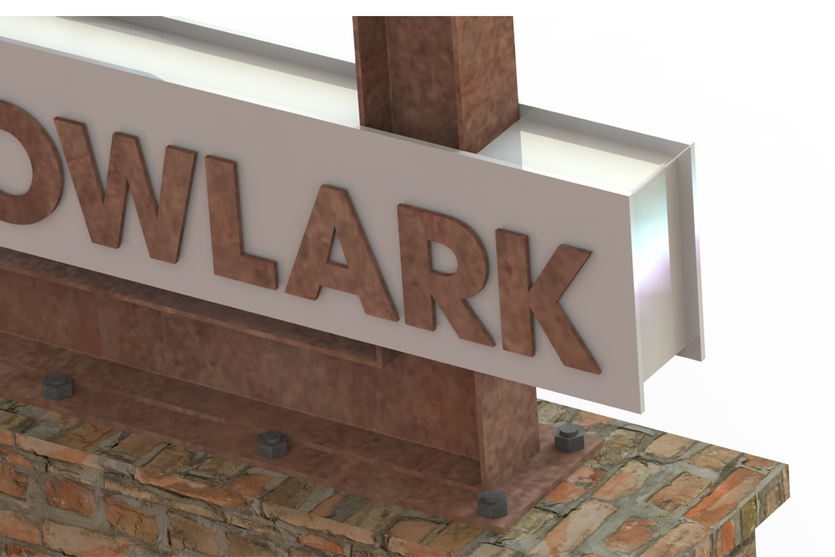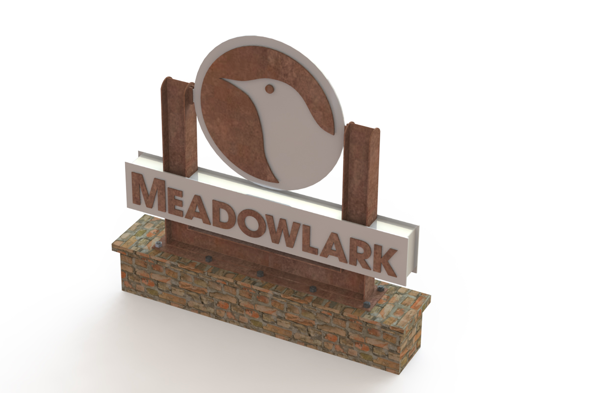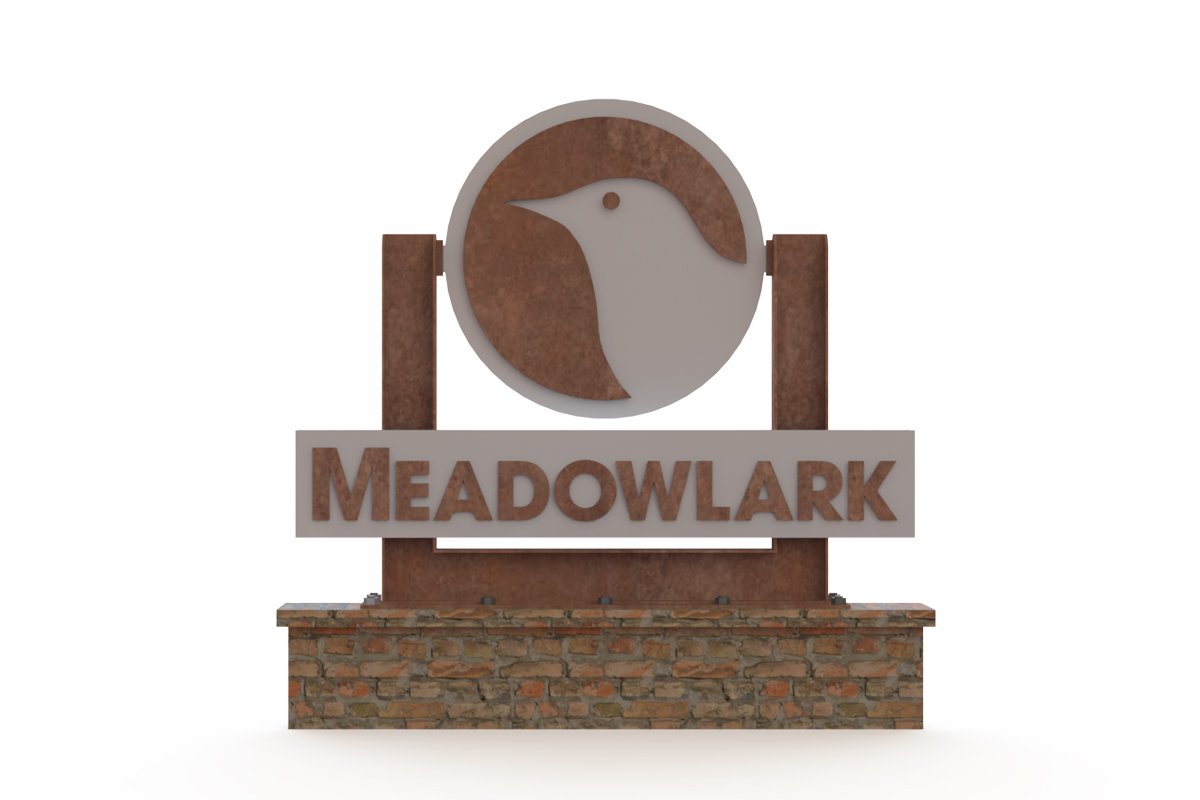 Ann Arbor, MIThe corporate entrance sign for Meadowlark Builders; I-beam main with ½” plate floating center logo. Distressed chocolate brown patina finish accented by ivory powder coat center plate. Tags: Research & DesignSteelPatinaCorporateAnn ArborMichigan